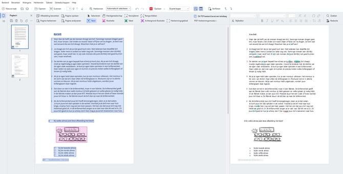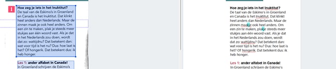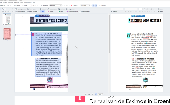 - Aan de linkerkant zie je de vlakken staan die ABBYY herkent heeft. Aan de rechterkant zie je de tekstlaag. Dit is wat er uiteindelijk voorgelezen gaat worden. Staat daar iets niet goed zoals in dit voorbeeld, dan wordt het niet goed voorgelezen: