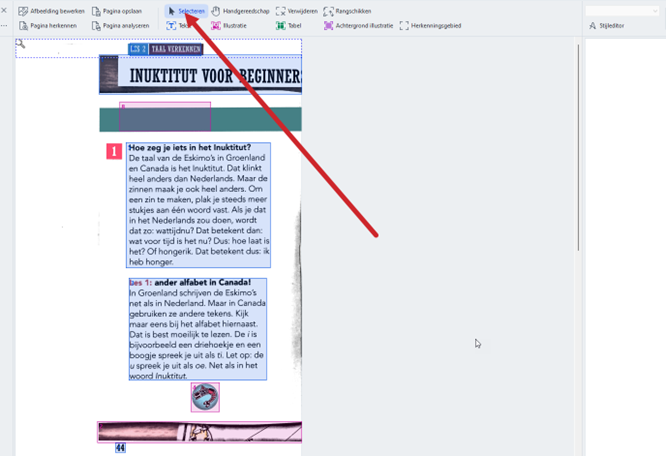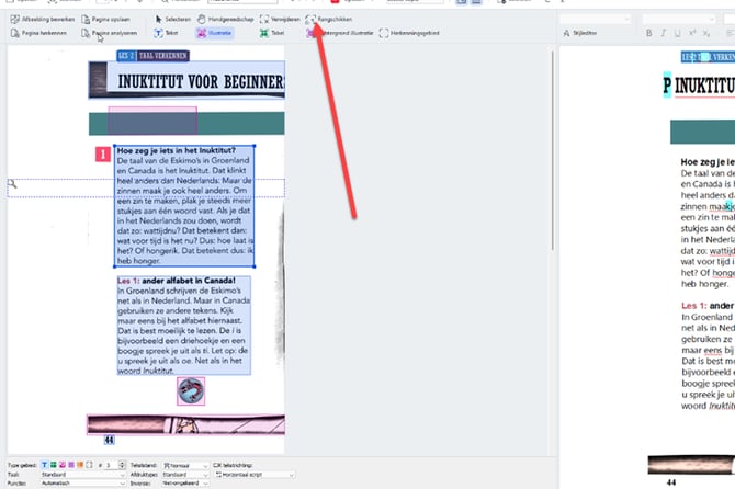 Omdat je opslaat als pdf in een exacte kopie, zijn illustraties niet van belang, je slaat namelijk uiteindelijk een pdf met 2 lagen op: een tekstlaag en een fotolaag, waardoor de uitvoer voor de leerling exact gelijk is aan het originele boek. Je gebruikt ABBYY om de tekstlaag zo goed mogelijk te bewerken zodat TextAid de tekstlaag goed voor kan lezen. De leerling ziet de tekstlaag niet, dus je hoeft niet per se te letten op opmaak (bijvoorbeeld aanpassen van het lettertype of tekstkleur), dat zie je namelijk uiteindelijk toch niet!