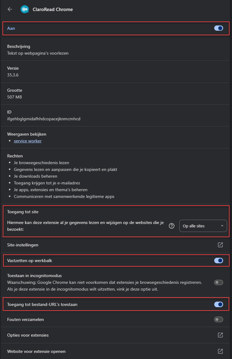 • Staat daar 'Deze extensie heeft geen aanvullende sitetoegang' dan heeft de extensie in het geheel geen toegang tot welke site dan ook en kan de ClaroRead-extensie niet voorlezen van een webpagina.