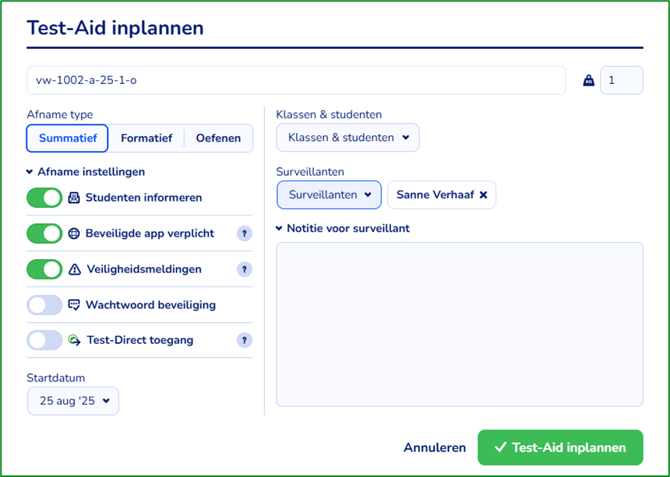 Het is mogelijk om een notitie voor de surveillant achter te laten.