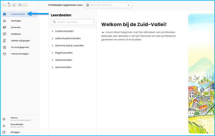 Klik op de knop ‘Instant printer’. De Instant printer opent een nieuw selectiemenu waarin je binnen een spellingcategorie het gewenste leerdoel kunt selecteren. Je kunt ook direct zoeken in het menu.