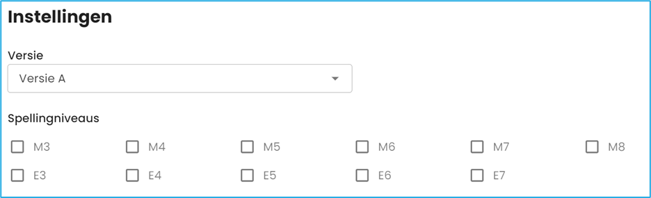Klik op de knop ‘Nieuwe methodetoets’. Onderstaand scherm verschijnt in beeld, waarin kan worden aangegeven welke versie van de methodetoets moet worden afgenomen en ook welke blokken van het dictee moeten worden afgenomen, onder het kopje ‘Spellingniveaus’.