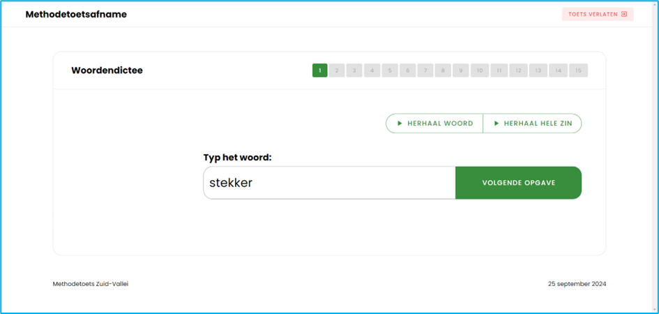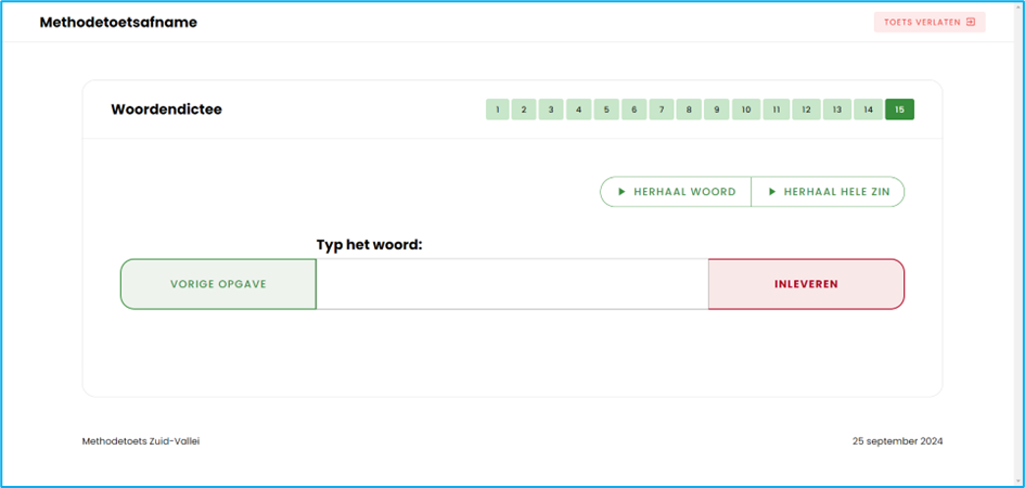 Na de voorbeeldopgave start de toets. Eerst is een zin te horen, dan een woord uit die zin. Vervolgens moet de leerling dat woord typen in een invoerveld.