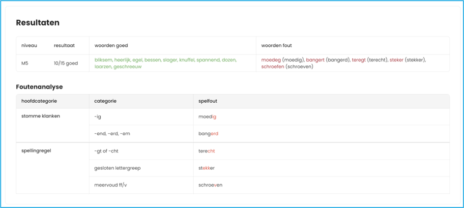 Hieronder staat een voorbeeld van een analyse. In de analyse is terug te vinden welke woorden door het kind goed en fout gespeld zijn. Daarnaast laat de Printer zien in welke categorieën deze woorden vallen.