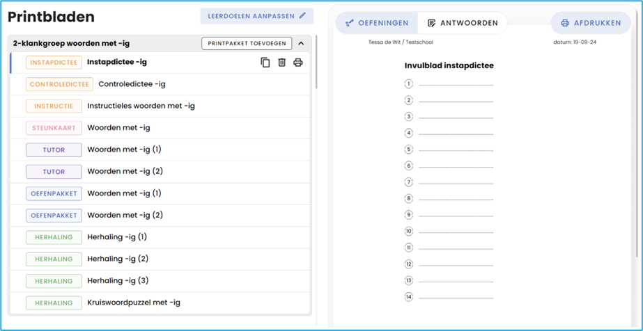 Als je tevreden bent met de selectie, kun je kiezen welke materialen je wilt uitprinten. Bij elk spellingonderdeel is een instructieles beschikbaar, perfect wanneer binnen de begeleiding een start wordt gemaakt met dit specifieke spellingonderdeel. Er is oefenmateriaal met begeleiding en oefenmateriaal zonder begeleiding beschikbaar. Daarnaast kunnen steunkaarten, dictees en de nodige herhalingsbladen worden geprint. En uiteraard kunnen docenten en RT’ers van elk printpakket de antwoordbladen genereren.