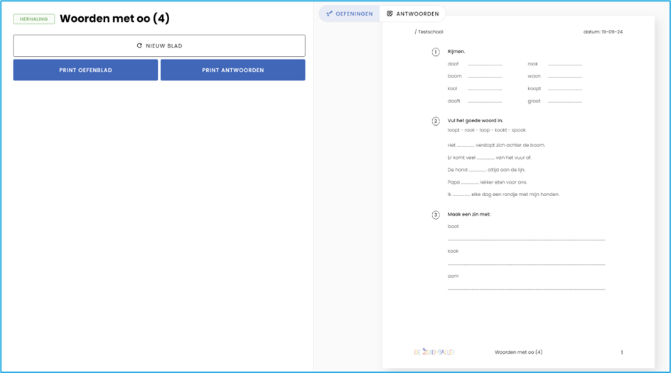 In het volgende scherm staat je printblad klaar. Je kunt zowel de oefeningen als de antwoorden uitprinten. De knop ‘Nieuw blad’ genereert een nieuwe variatie op de oefeningen, zodat je de stof blijvend kunt herhalen.