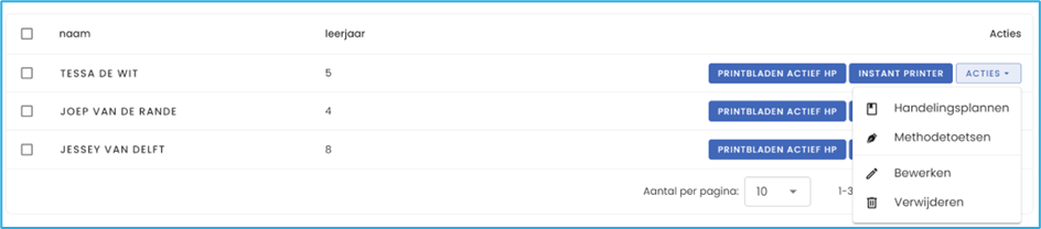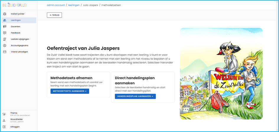Als admin kun je leerlingen toevoegen, bewerken of verwijderen. Per leerling kun je een handelingsplan opstellen en methodetoetsen afnemen.