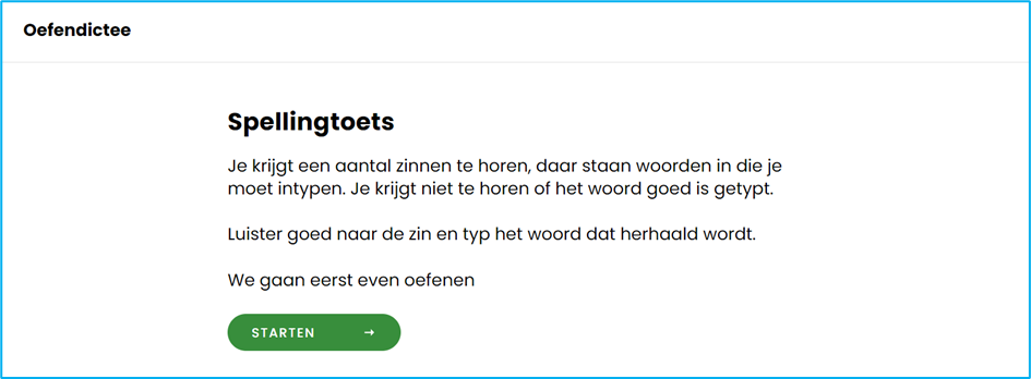 Wanneer je de toetsafname start wordt er eerst gestart met een opgave voorafgaand aan het daadwerkelijke dictee. Alle instructies die bij het dictee horen, staan in beeld en worden tegelijkertijd auditief ondersteund.