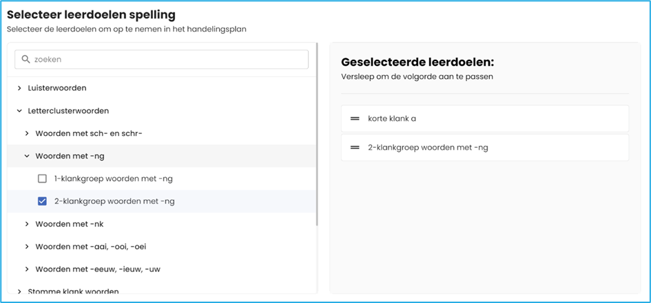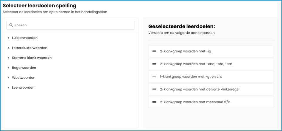 Voor het handelingsplan kun je meerdere leerdoelen selecteren. Aan de rechterkant van het scherm kun je leerdoelen verslepen met je muis om de volgorde te bepalen.