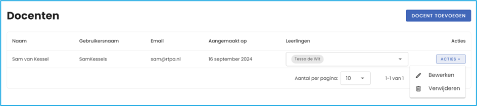 Als admin kun je docenten toevoegen, verwijderen of bewerken. Elke docent kan vervolgens worden gekoppeld aan een of meerdere leerlingen.