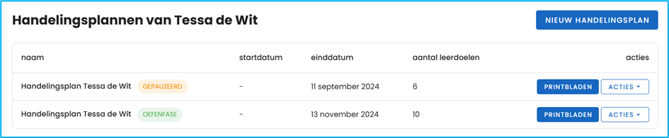 Als je in het leerlingmenu klikt op ‘Acties’ en daarna op ‘Handelingsplannen’, kom je in een scherm waar je een nieuw handelingsplan kunt aanmaken.