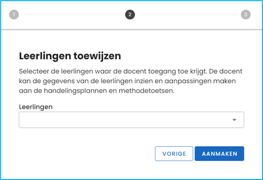 Klik daarna op de blauwe knop ‘Aanmaken’. De docent ontvangt een e-mail met daarin de inloggegevens. Het docentenaccount is nu aangemaakt.