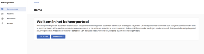 Als je inlogt in het beheerportaal land je direct op de overzichtspagina. In het menu bij ‘Account’ zie je jouw school, met daarbij de ingestelde Basispoortkoppeling. ‘Rekenblobs ’en ‘Taalblobs’ zijn op dit moment de apps die gekoppeld kunnen worden. Als je daar op klikt, kom je op de overzichten van deze apps: