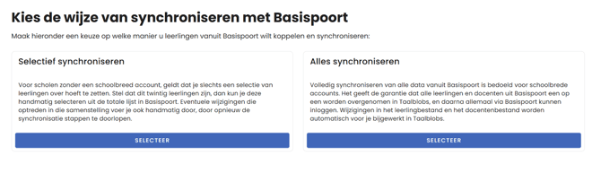 De naam alles synchroniseren zegt het eigenlijk al: alle docenten en leerlingen uit Basispoort worden meegenomen in de koppeling. Daarmee is het de meest geschikte synchronisatie voor schoolbrede accounts; aangezien iedereen daar recht heeft op toegang tot de apps. Als je dit eenmaal hebt ingesteld, worden daarna ook automatisch nieuwe leerlingen en docenten gesynchroniseerd.