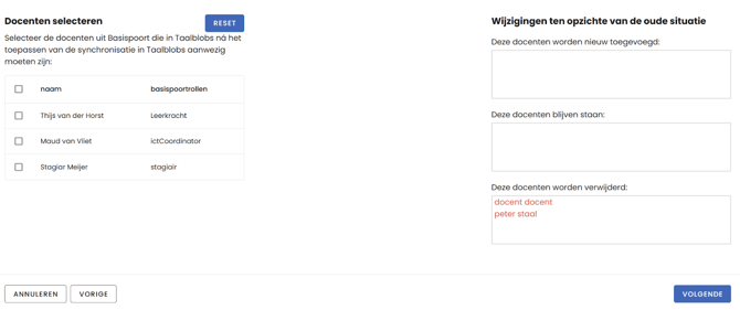 Hier doe je precies hetzelfde als in de vorige stap, maar dan voor docenten. Het is wat eenvoudiger, omdat we niet eerst docenten matchen. Je kiest direct welke docenten er in de app moeten komen. Alle bestaande docenten worden verwijderd.