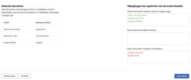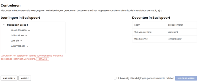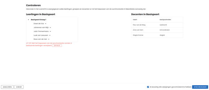 De laatste stap in het proces. Hier staat exact aangegeven welke docenten en leerlingen er na de synchronisatie aanwezig zullen zijn in de app. Loop hier dus nog eens extra goed doorheen. Als alles klopt, kun je dat bevestigen en vervolgens synchroniseren.