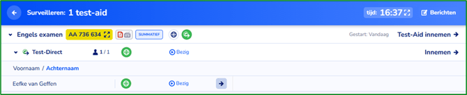 Zodra de toetsafname is gestart wordt het surveillancescherm zichtbaar voor jou of de collega die surveilleert. In dit scherm is de toets zichtbaar. Pas zodra de toets is ingenomen, zal de toets uit dit overzicht verdwijnen. Verder kun je vanuit het surveillancescherm de toetsafname monitoren en de voortgang van de leerlingen in zien.