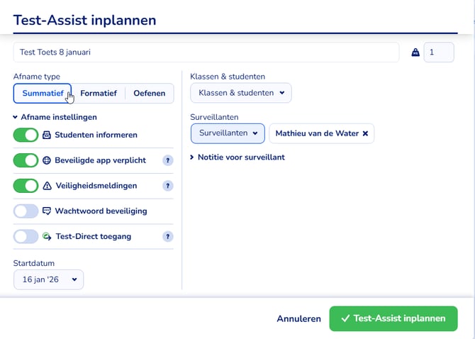 - Selecteer de datum voor de toets (in een nabije update kun je hier ook de tijd invullen waardoor de toets automatisch gestart wordt en afname zonder actieve surveillant plaats kan vinden)