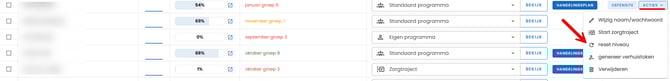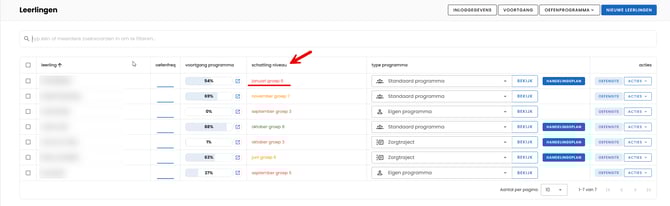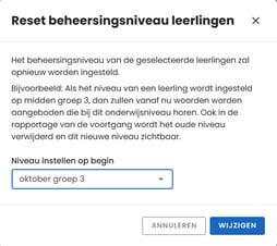 Wil je het niveau aanpassen? Klik dan helemaal rechts op de witte knop "acties" met de optie "reset niveau" kun je een ander groepsniveau aangeven voor uw kind.