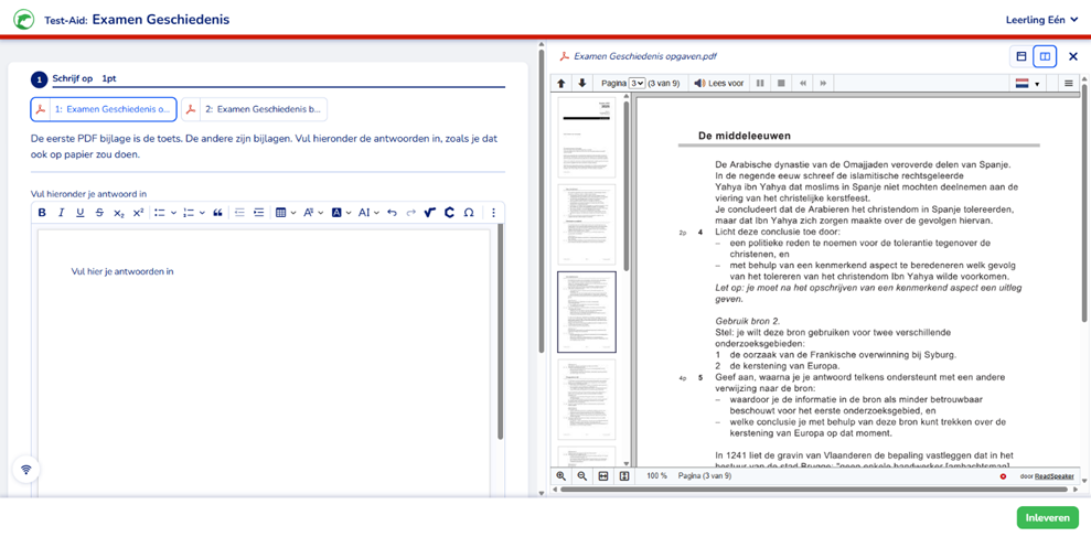 Bij de optie ‘PDF voorlezen’ kunnen leerlingen de toets digitaal inzien en laten verklanken, maar beantwoorden zij de vragen op papier. Bij de optie ‘Digitaal beantwoorden’ worden toetsen volledig binnen de applicatie gemaakt. Bij elke toets kan worden ingesteld op welke manier de toets afgenomen moet worden en welke opties beschikbaar zijn, zoals de mogelijkheid om spellingcontrole te gebruiken.