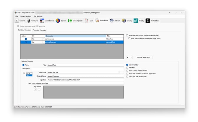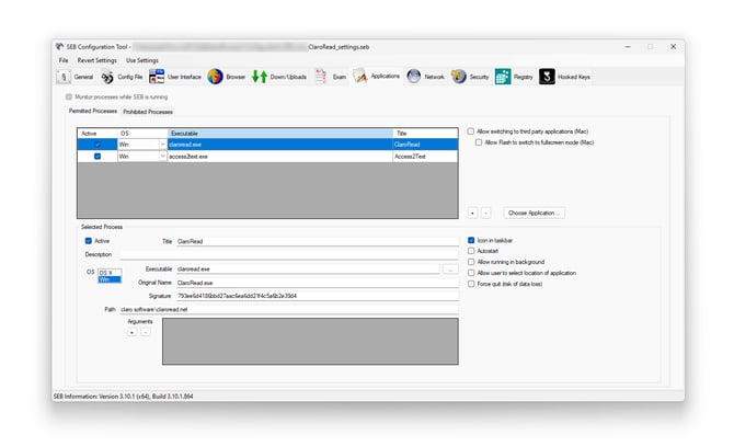 In Safe Exam Browser Configuration Tool -> Applications -> Permitted Processes: