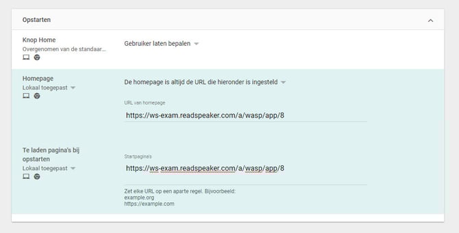 - Scrol naar beneden tot het onderdeel Opstarten. Hier stel je de homepage in. Zorg ervoor dat dit de url: https://ws-exam.readspeaker.com/a/wasp/app/8 is. Dit is de login voor examen accounts.