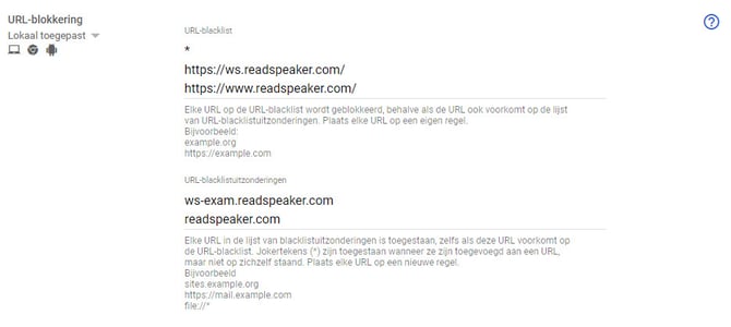 Het effect is dat alles in eerste instantie wordt geblokkeerd (door middel van het sterretje). De uitzondering is de loginpagina voor het toetsaccount. Verder moet readspeaker.com openstaan omdat er na het inloggen op de achtergrond onderdelen moeten worden ingeladen (bijvoorbeeld docreader-eu.readspeaker.com) voor het weergeven van de toets en het laden van de verschillende voorleesstemmen. Door ws.readspeaker.com en www.readspeaker.com apart te blokkeren voorkom je dat leerlingen ergens anders in kunnen loggen dan de login-pagina voor toetsaccounts.