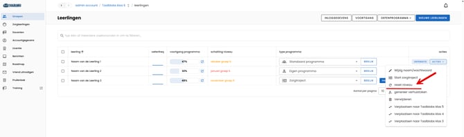 Ga bij de naam van de leerling waarbij je het niveau wil wijzigen naar rechts en klik op de knop: 'ACTIES".