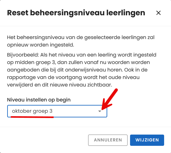 Nadat je hier op hebt geklikt komt er een pop-up scherm tevoorschijn waarbij je het niveau van de leerling/het kind kunt zien en eenvoudig kunt wijzigen naar het gewenste niveau.